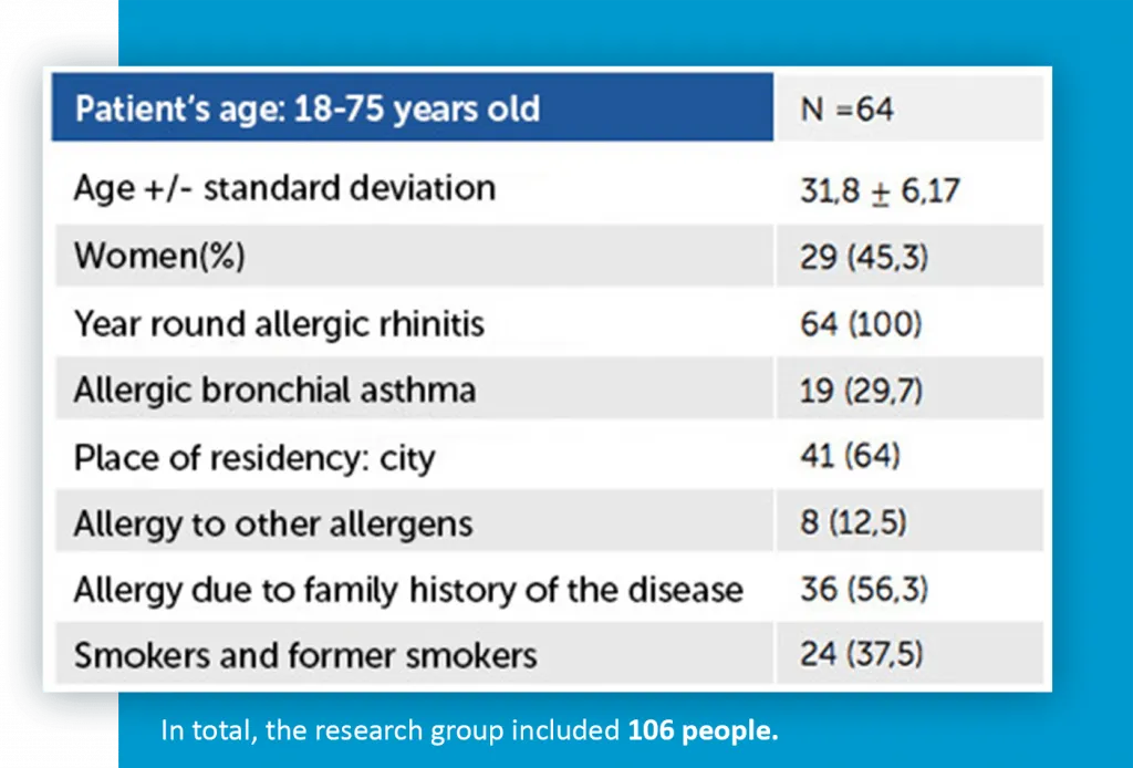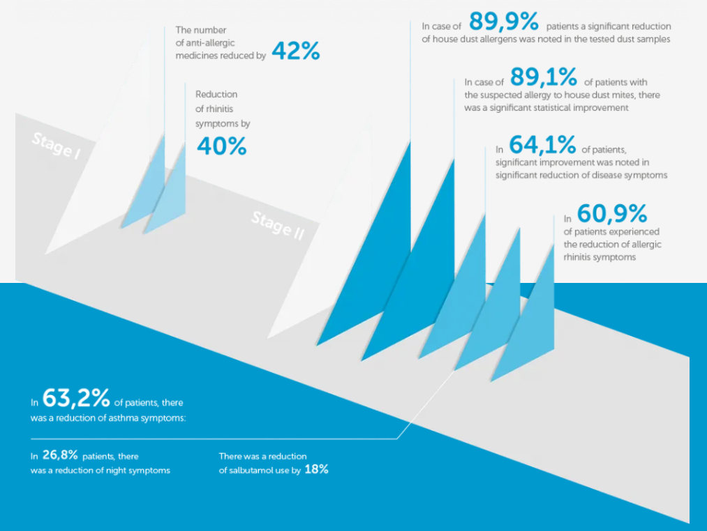 According to the study protocols, the procedure were performed on patients which consisted in one month observation of the symptoms of allergic disease and evaluation of the use of symptomatic drugs before and after the preventive intervention. At the same time, the presence and concentration of the main mite allergen D. pteronyssinus (Der p 1) was monitored in the samples of mattress dust collected and the allergen-specific level of IgE in the blood serum of the examined persons was assessed.